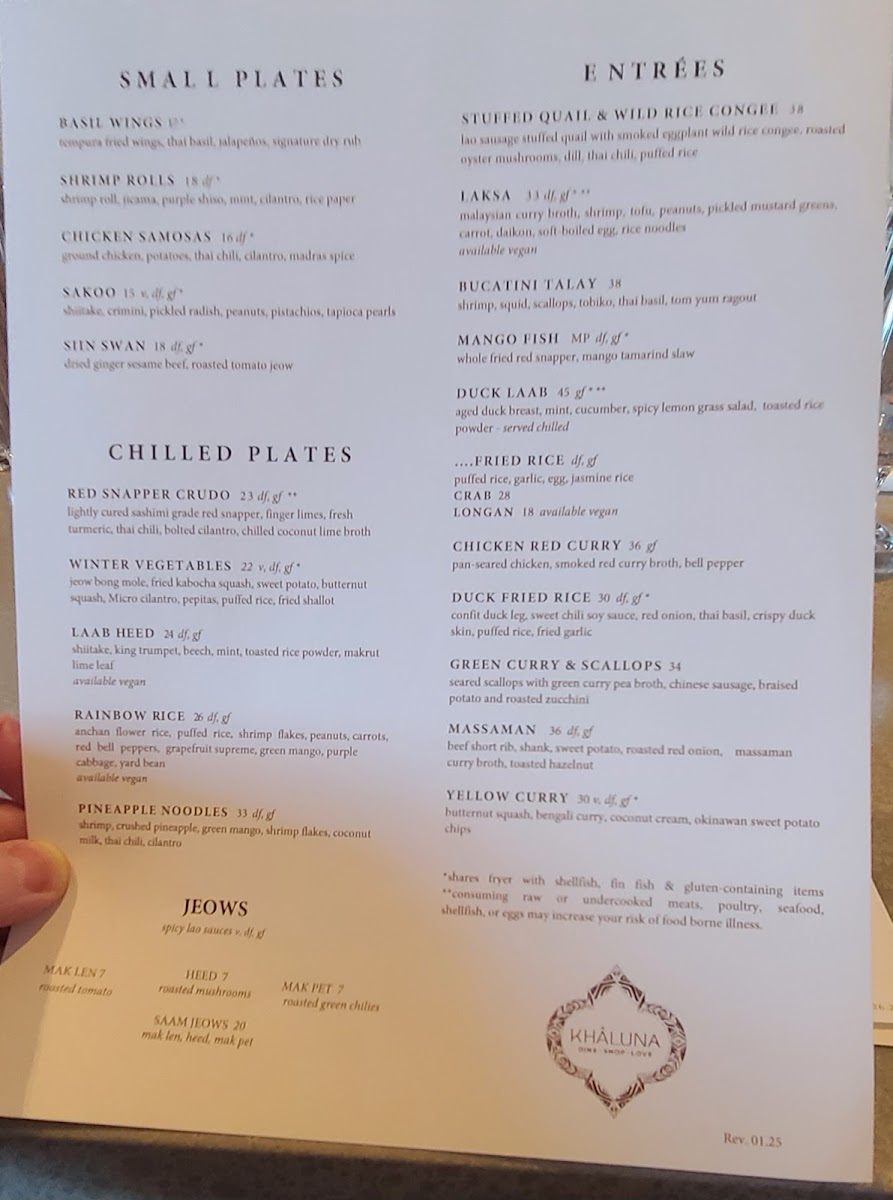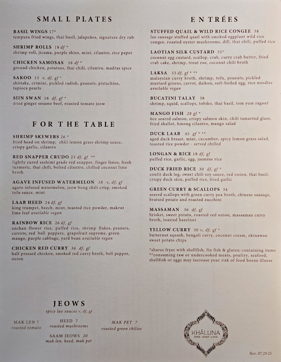 At Khâluna, the menu is a tapestry of delightful offerings, each dish crafted to exhibit the vibrant tastes of Laotian cuisine. Dive into the Chilled Plates section, where the Laab Heed showcases an exquisite medley of shiitake mushrooms, king trumpet, and beech mushrooms harmonized with the freshness of mint and makrut lime leaf. This dish is not only gluten-free and dairy-free but can also be enjoyed vegan, making it a versatile choice for a range of dietary preferences. Make sure to also try the Rainbow Rice, a colorful combination of anchan flower rice adorned with shrimp flakes, peanuts, and zesty ingredients that create a delightful parade of flavors. At just $24 for the Laab Heed and $2 for the Rainbow Rice, these dishes are authentic representations of the rich culinary culture.