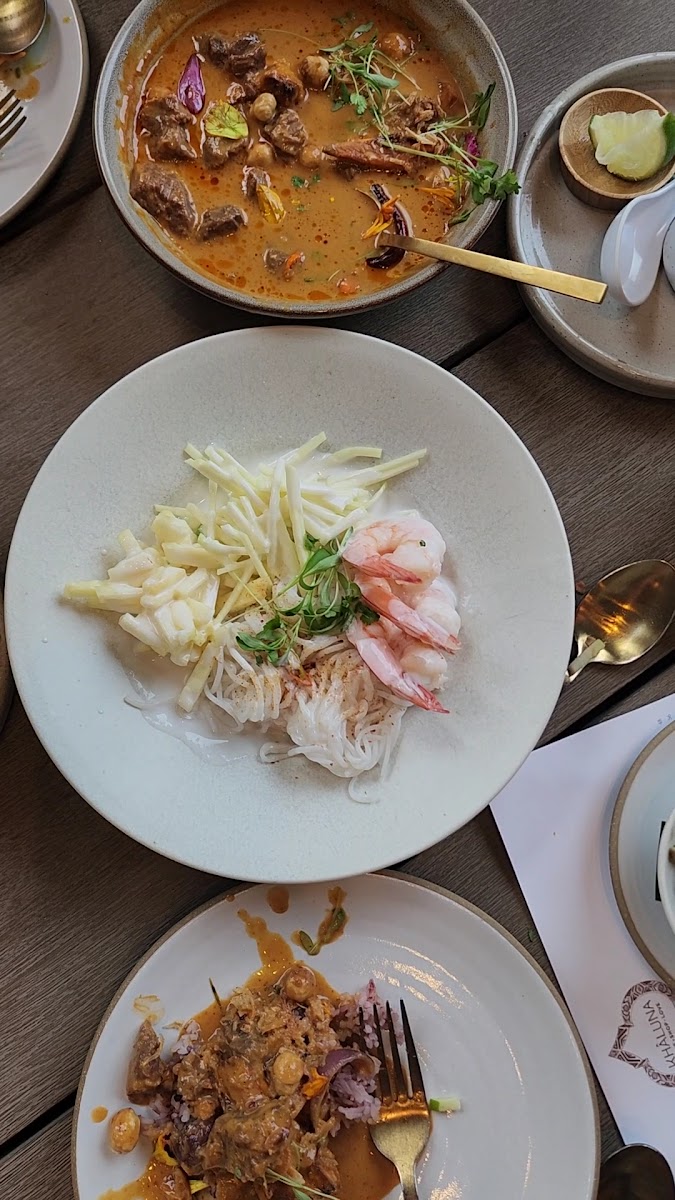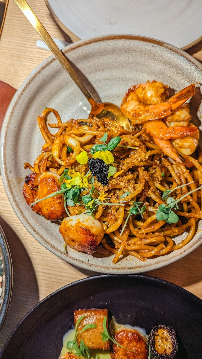 Moving on to the Entrees, the standout dish is undoubtedly the Bucatini Talay, which has earned recognition from Food & Wine magazine as one of the 'Most Boundary Pushing Noodles of 2022'. Featuring tender bucatini noodles intertwined with shrimp, squid, and scallops, it's beautifully nestled in a tom yum ragout that captivates your palate. For $38, this plate is a treasure trove of flavors that will leave you wanting more.
